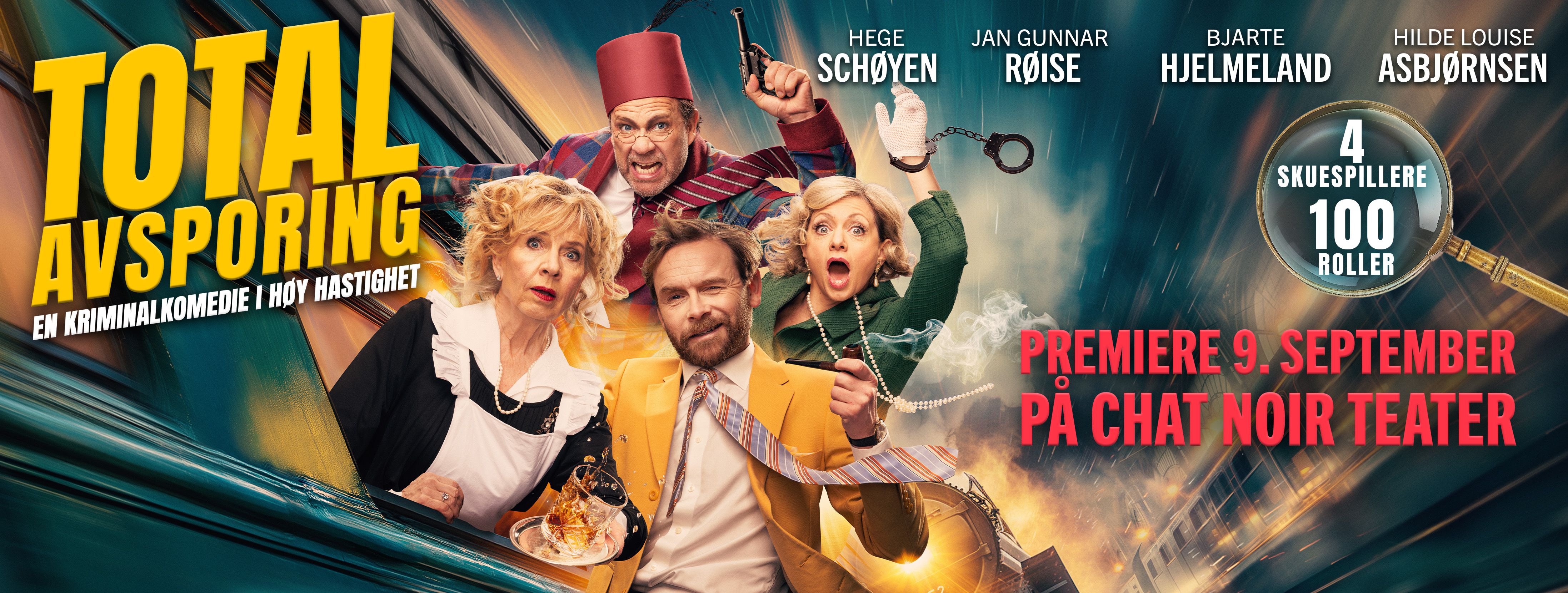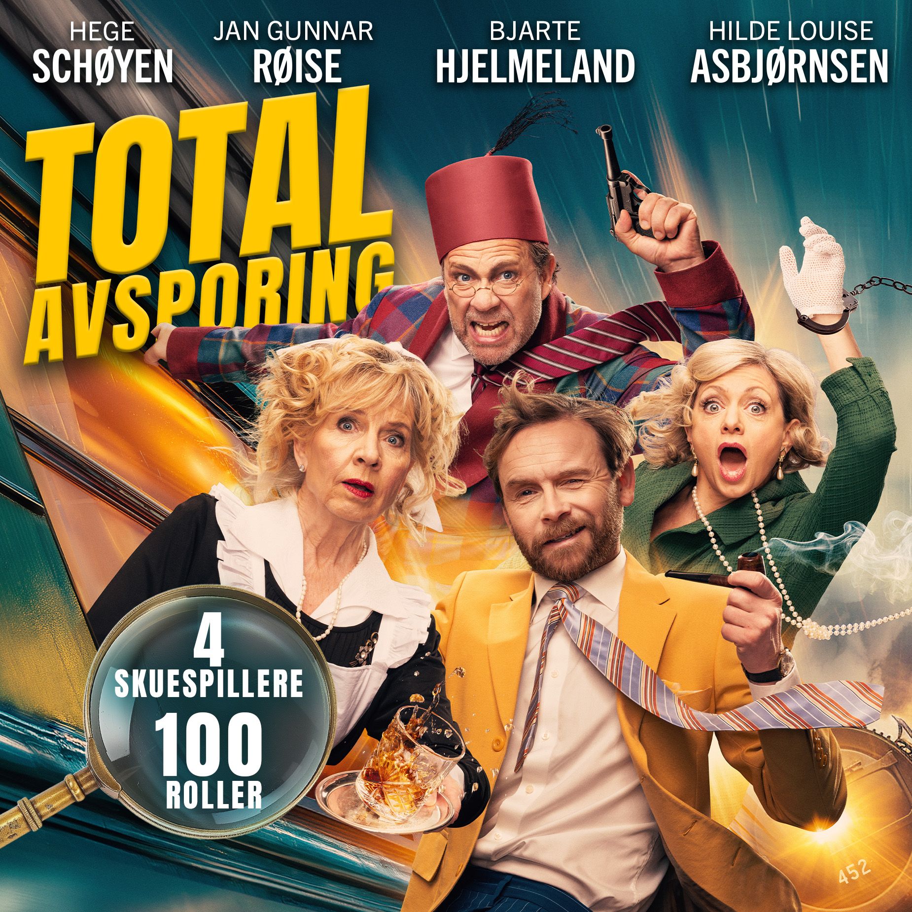 På scenen står Hege Schøyen, Jan Gunnar Røise, Bjarte Hjelmeland og Hilde Louise Asbjørnsen – fire erfarne stjerneskuespillere som tar på seg over 100 roller i denne elleville forestillingen. Med lynraske skift, fysisk komedie og uforutsigbare vendinger er dette en teateropplevelse du sent vil glemme!