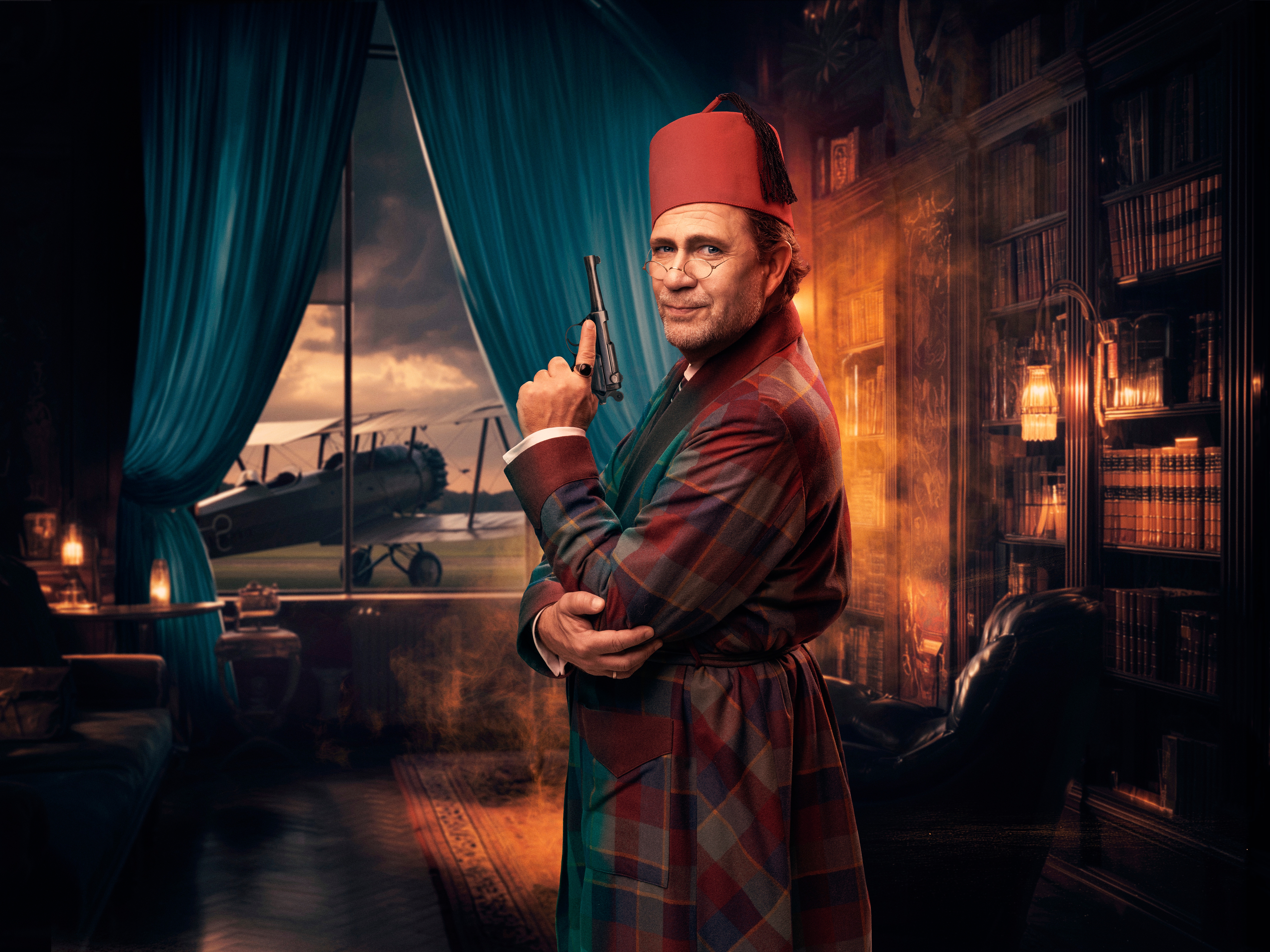 Følg Richard Hannay (Jan Gunnar Røise), vår uheldige helt, som blir uskyldig anklaget for mord. Han må flykte fra politiet, lure slu spioner og sjarmere mystiske damer – samtidig som han holder hjertet, stilen og barten på plass. Ved hans side forvandler Hege Schøyen og Bjarte Hjelmeland seg lynraskt til et helt persongalleri – fra servitører og hotellgjester til togkonduktører, politifolk og tvilsomme typer – mens Hilde Louise Asbjørnsen stråler som gåtefulle og forførende kvinner.